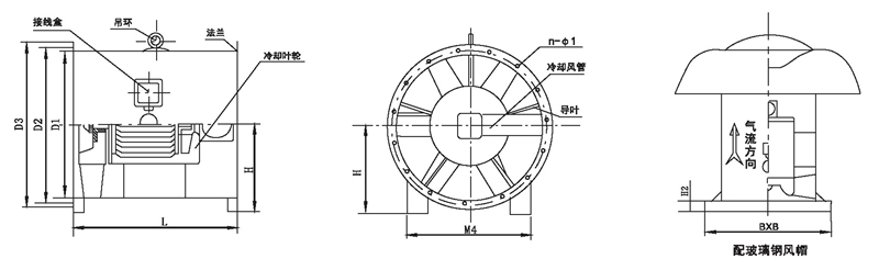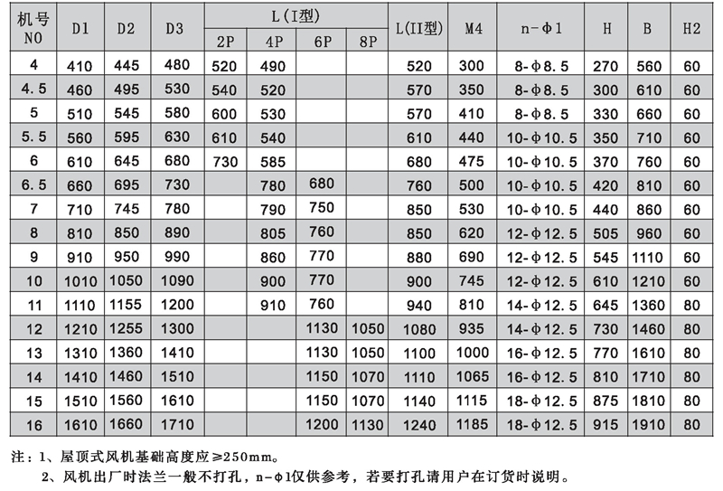 注: HTF型可根據需要制成消音型(進出風端加置專用消聲器) ;表示方法: 機號后面加字母“X”。HTF型均可制成屋頂式,表示方法:機號后面加字母“W”