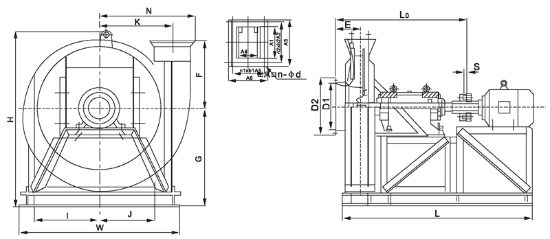 9-19、9-26系列4A~6.3離心風(fēng)機(jī)外形尺寸圖、表