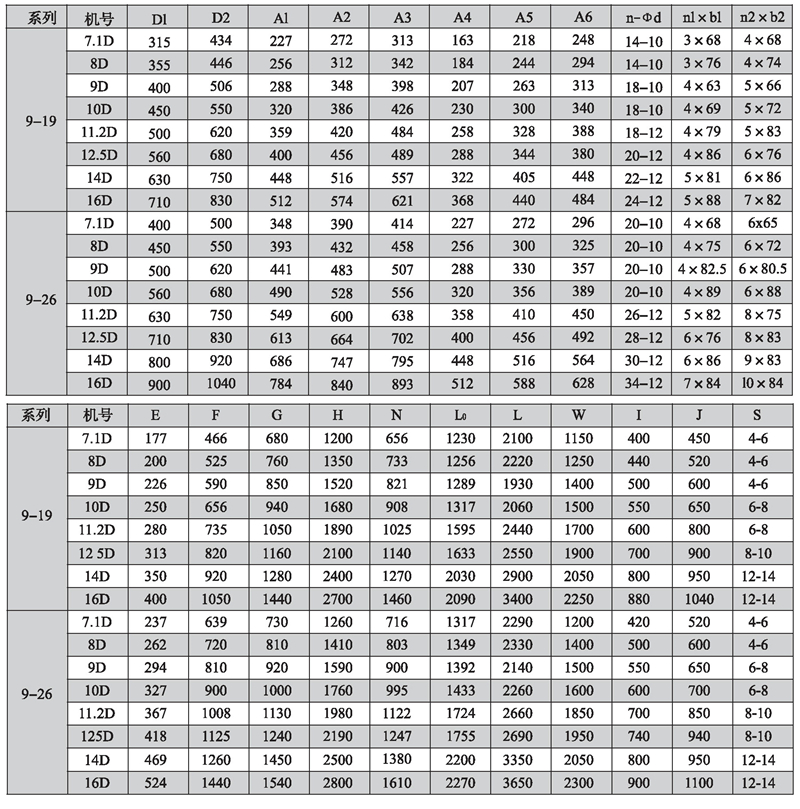 9-19、9-26系列7.1D~16D離心風(fēng)機(jī)外形尺寸圖、表